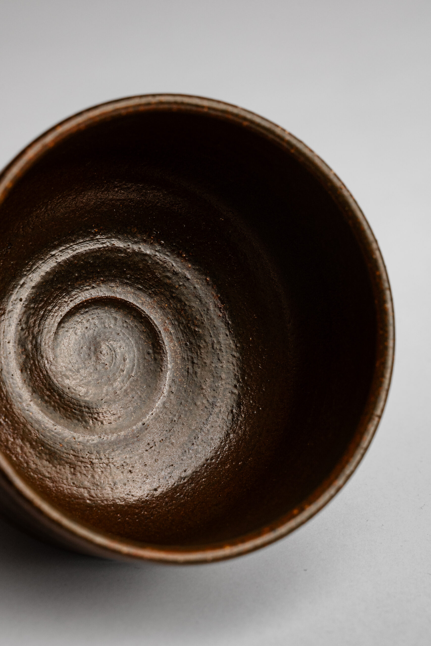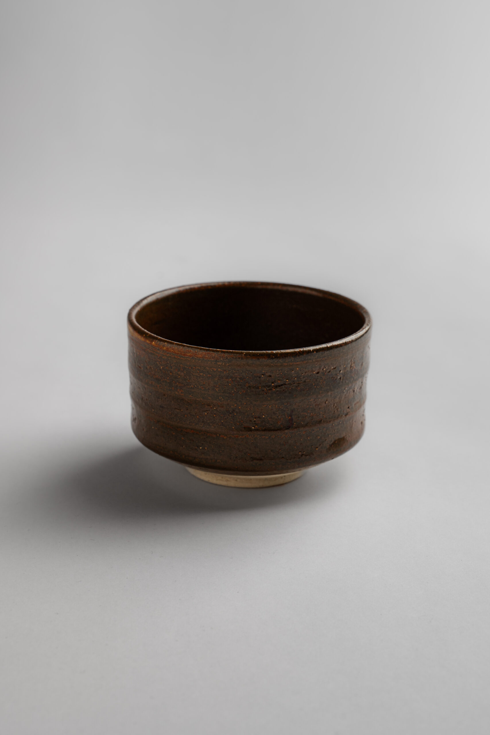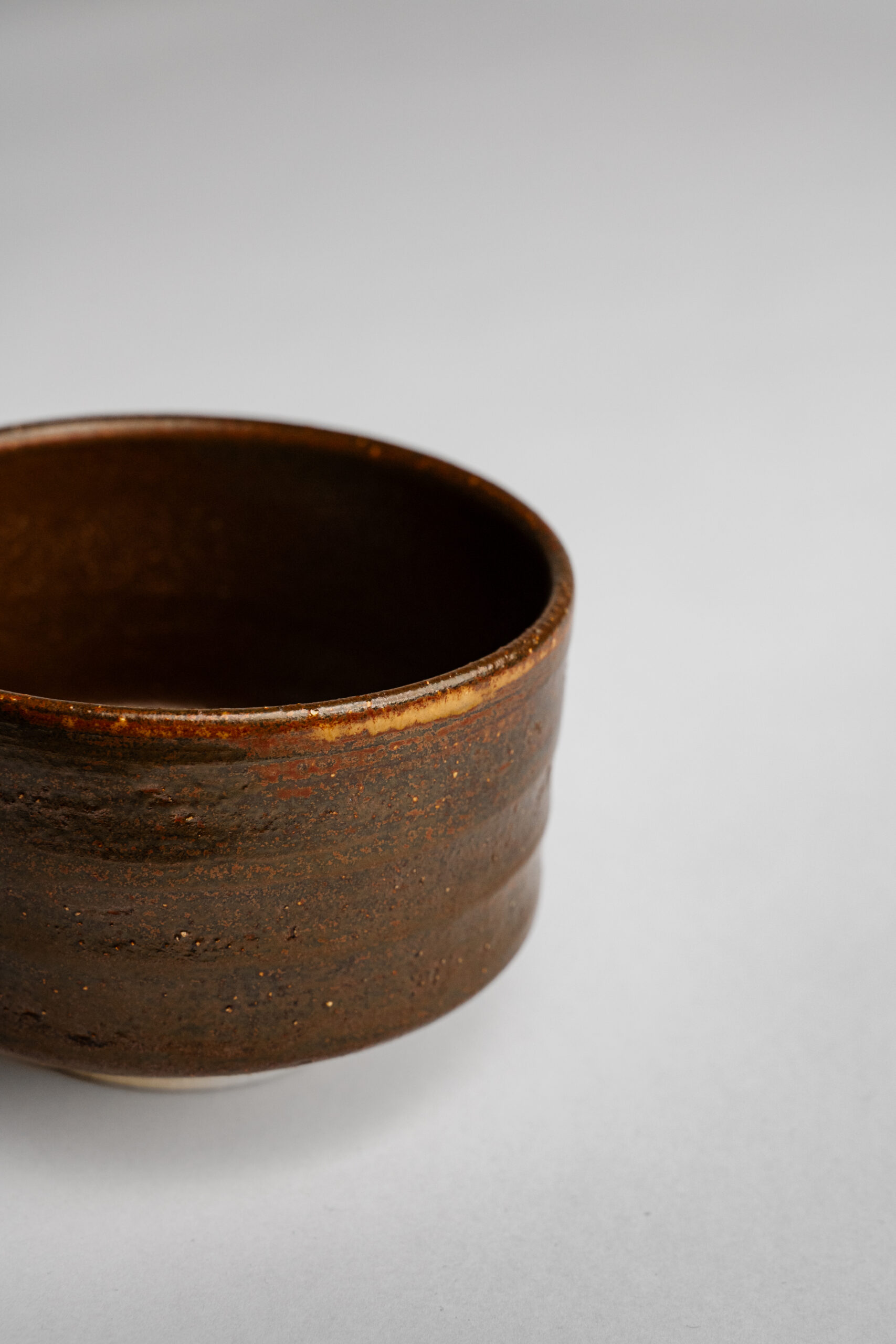 Chawan (茶碗) z japonskej kameniny s tradičnou železitou vysokovýpalovou glazúrou, ktorá vyniká teplými hnedými tónmi a prirodzenou zemitou textúrou. Povrch misky nesie jemné stopy ohňa a hliny – každý kus je originálom vzniknutým v nepredvídateľnom procese výpalu.
