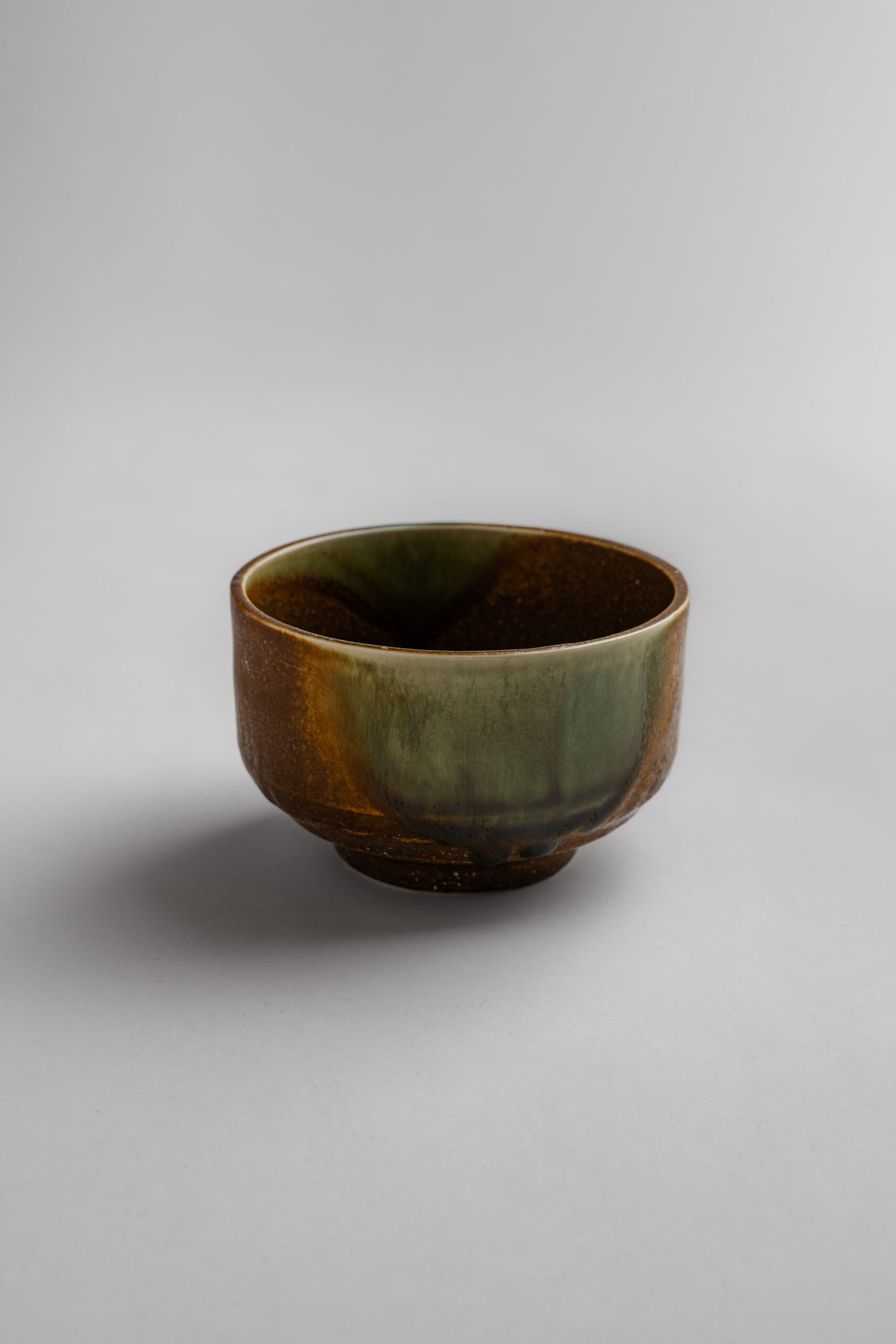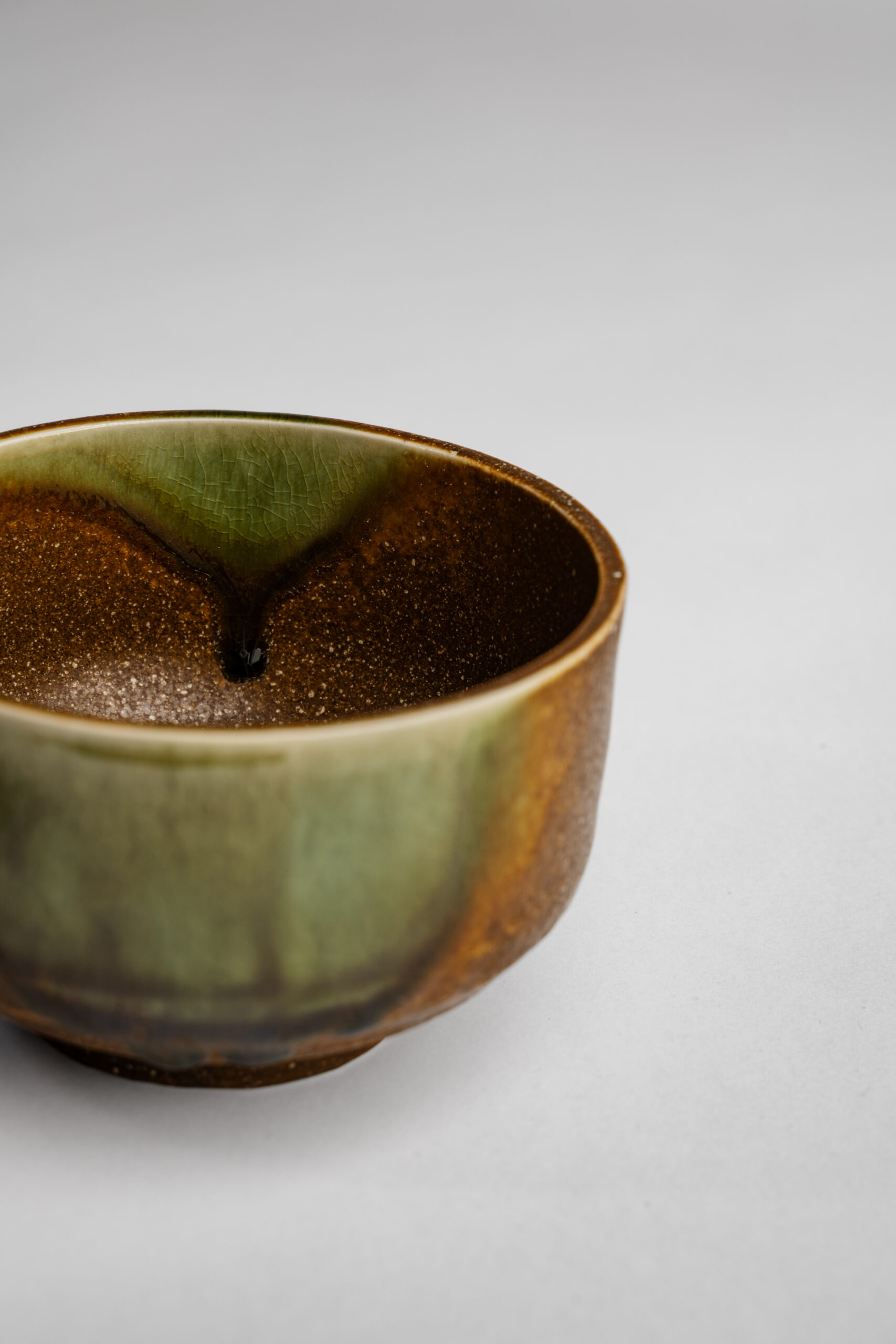 Chawan (茶碗) z japonskej kameniny s kombinovanou železitou vysokovýpalovou glazúrou a jemným zeleným prechodom na okraji misky. Tento prirodzený kontrast farieb vzniká počas výpalu a robí z každého kusa originál.