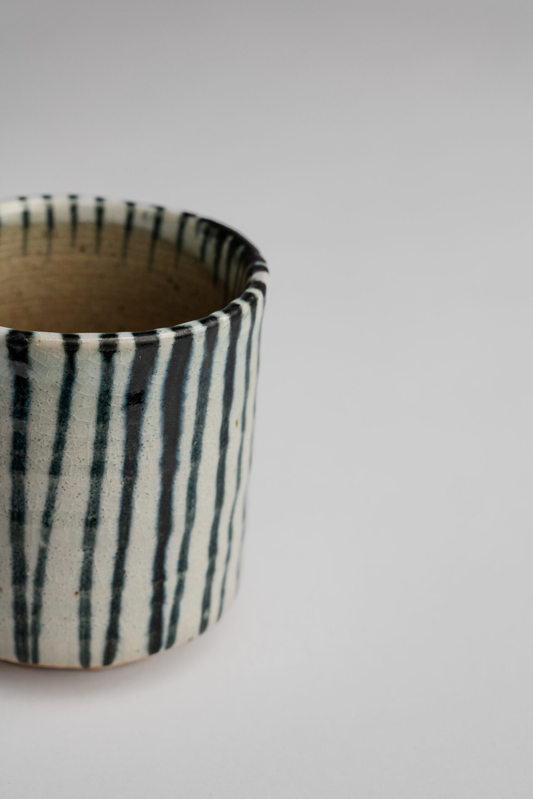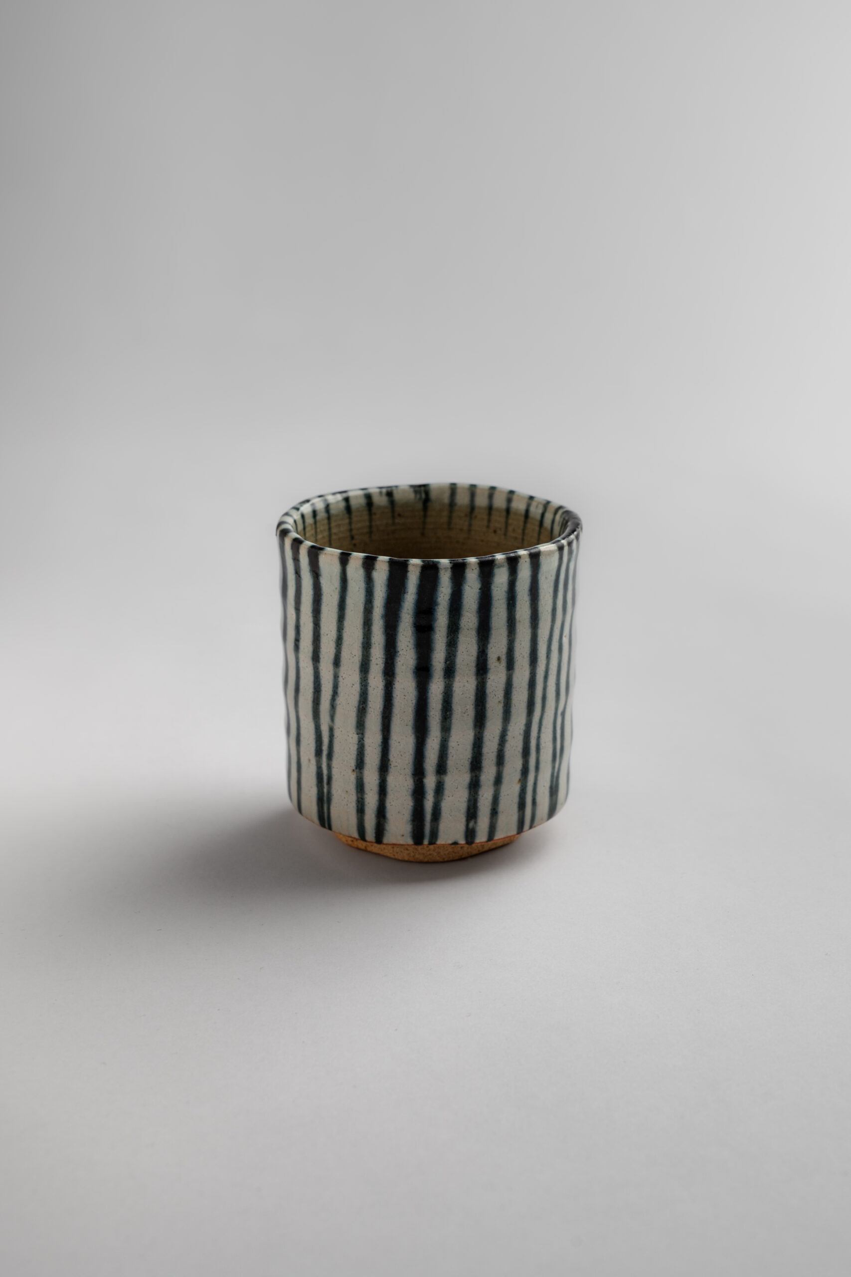Tento keramický pohár je vyrobený z japonskej kameniny (stoneware) a zdobený tradičným vzorom Tokusa (十草) – vertikálnymi ručne maľovanými líniami, ktoré symbolizujú rast, kontinuitu a jednoduchosť. Tokusa patrí medzi najstaršie a najobľúbenejšie dekory japonskej úžitkovej keramiky a je typický najmä pre oblasti Mino a Mashiko.